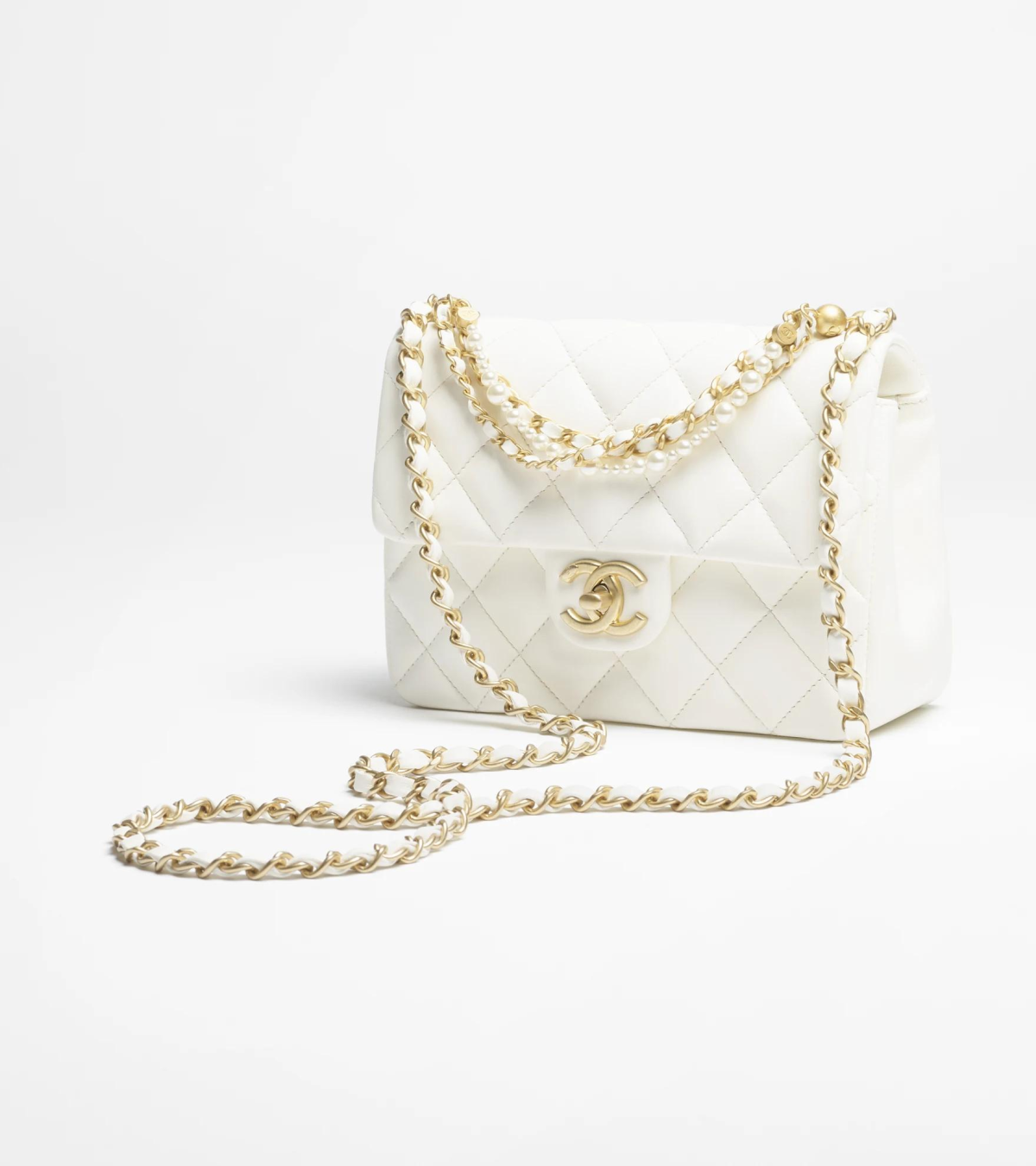 Piel de cordero brillante, perlas artificiales y metal dorado