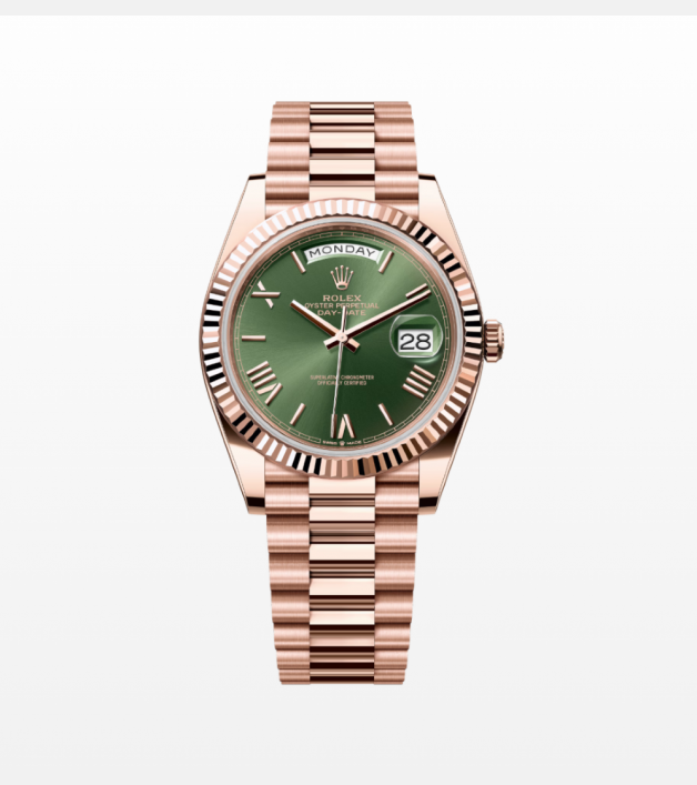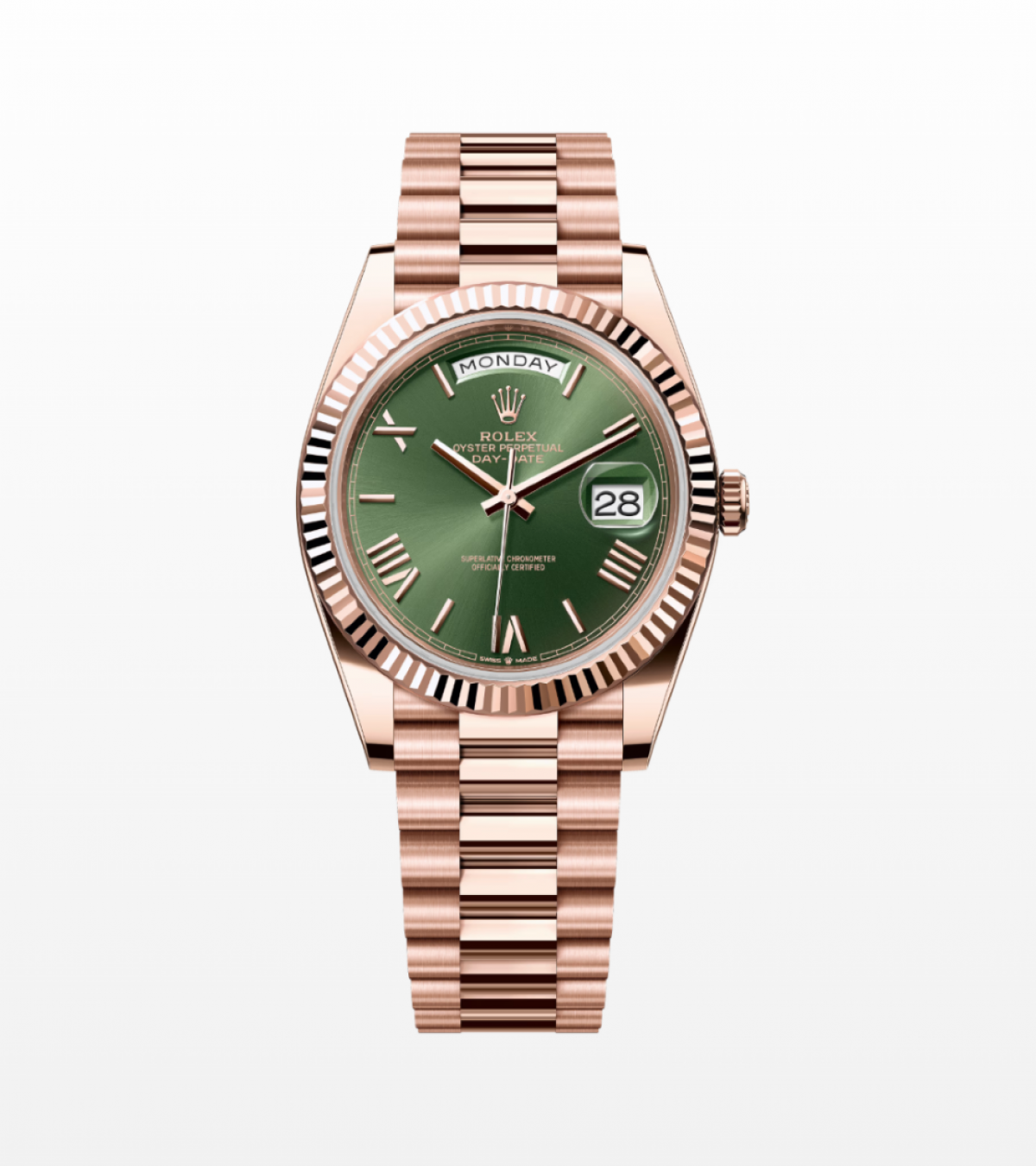 El Rolex Day-Date, lanzado por primera vez en 1956, es uno de los relojes más prestigiosos e icónicos de la marca. Fue el primer reloj de pulsera cronómetro, hermético y automático del mundo en mostrar tanto la fecha como el día de la semana escrito completo en una ventana en forma de arco a las 12 en punto.