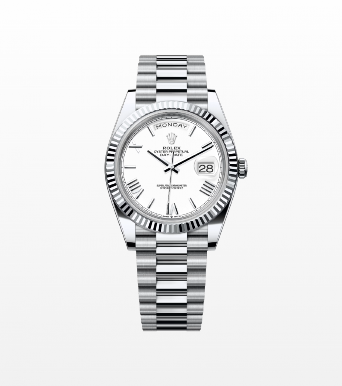 El Rolex Day-Date, lanzado por primera vez en 1956, es uno de los relojes más prestigiosos e icónicos de la marca. Fue el primer reloj de pulsera cronómetro, hermético y automático del mundo en mostrar tanto la fecha como el día de la semana escrito completo en una ventana en forma de arco a las 12 en punto.
