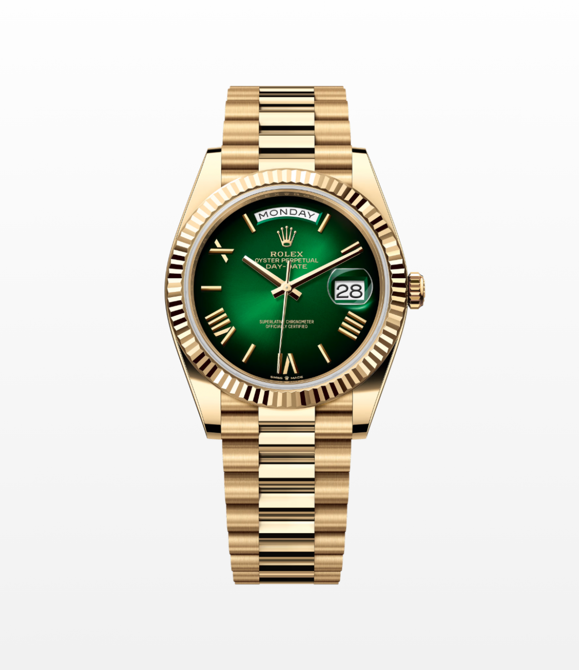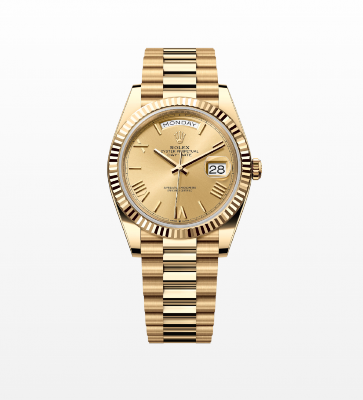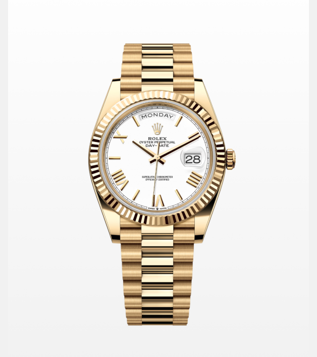 El Rolex Day-Date, lanzado por primera vez en 1956, es uno de los relojes más prestigiosos e icónicos de la marca. Fue el primer reloj de pulsera cronómetro, hermético y automático del mundo en mostrar tanto la fecha como el día de la semana escrito completo en una ventana en forma de arco a las 12 en punto.