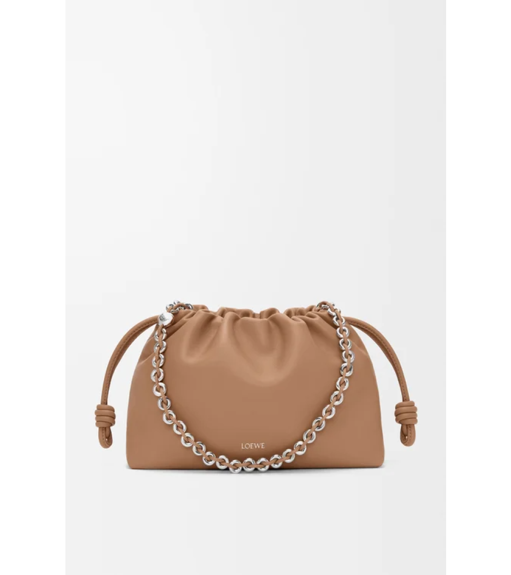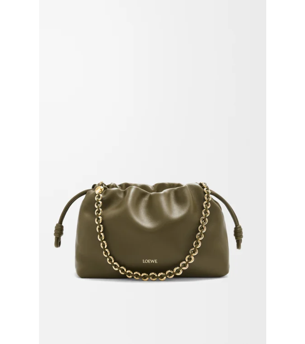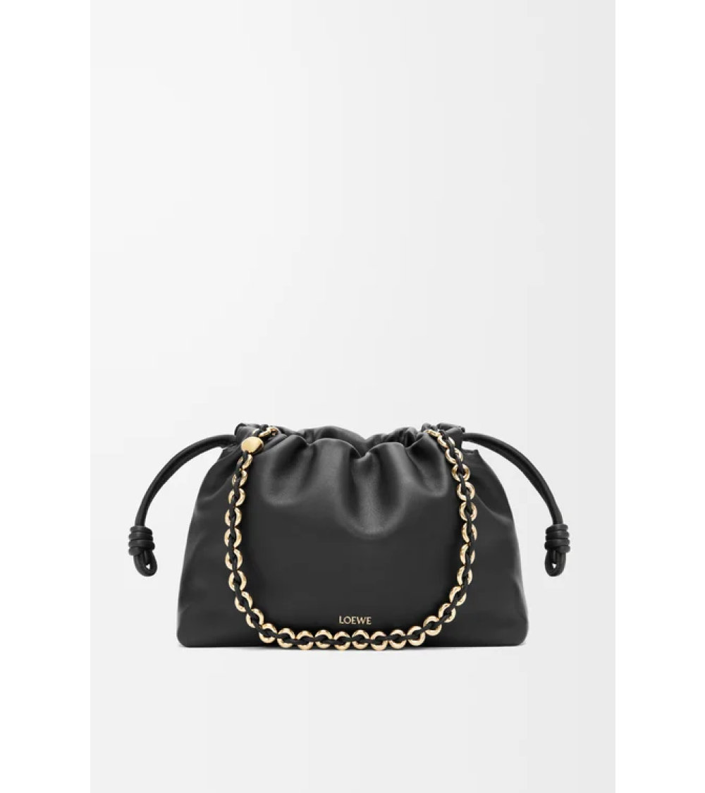 El bolso Flamenco es ligero y suave, con forma fruncida, cordones con nudos históricos y una cadena tipo donut. Esta versión mediana está confeccionada en suave piel de cordero napa.