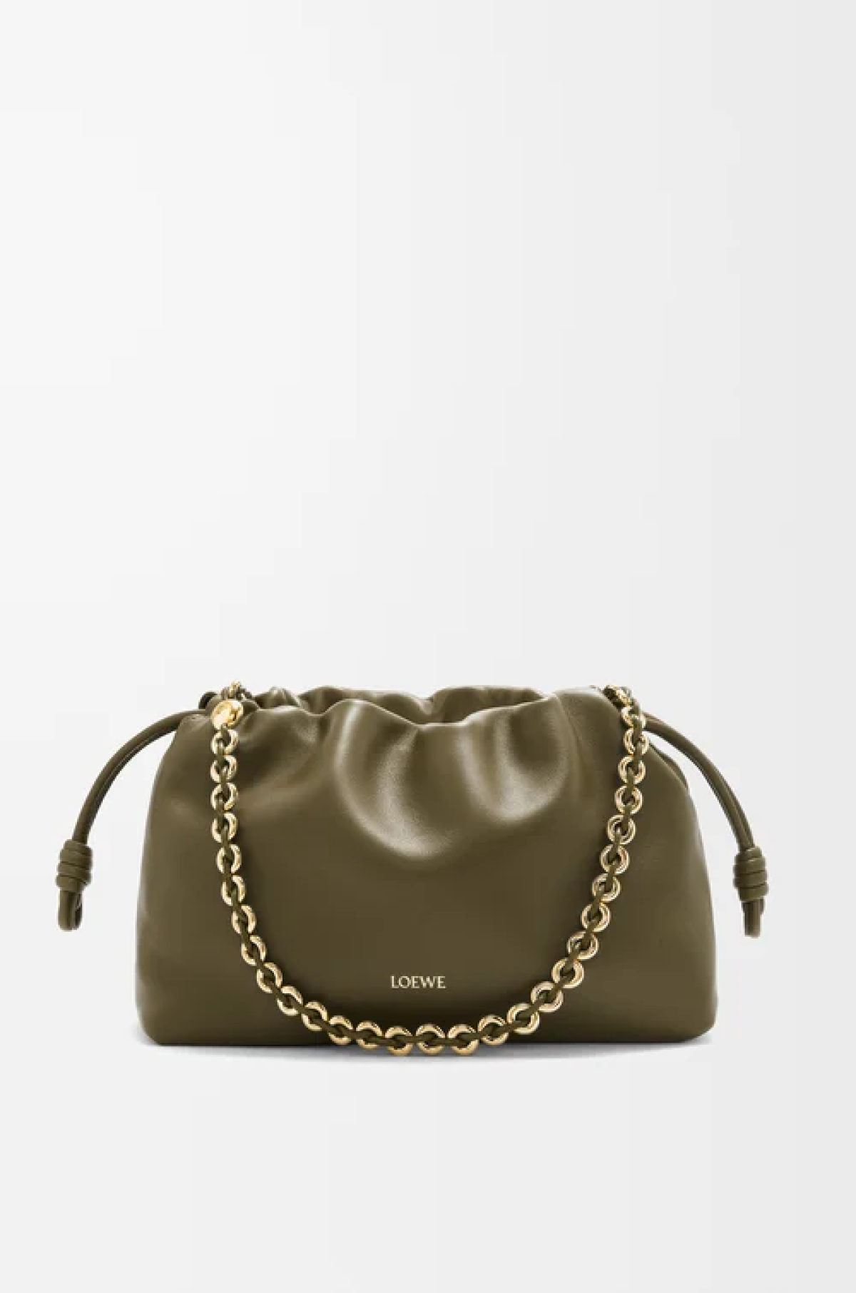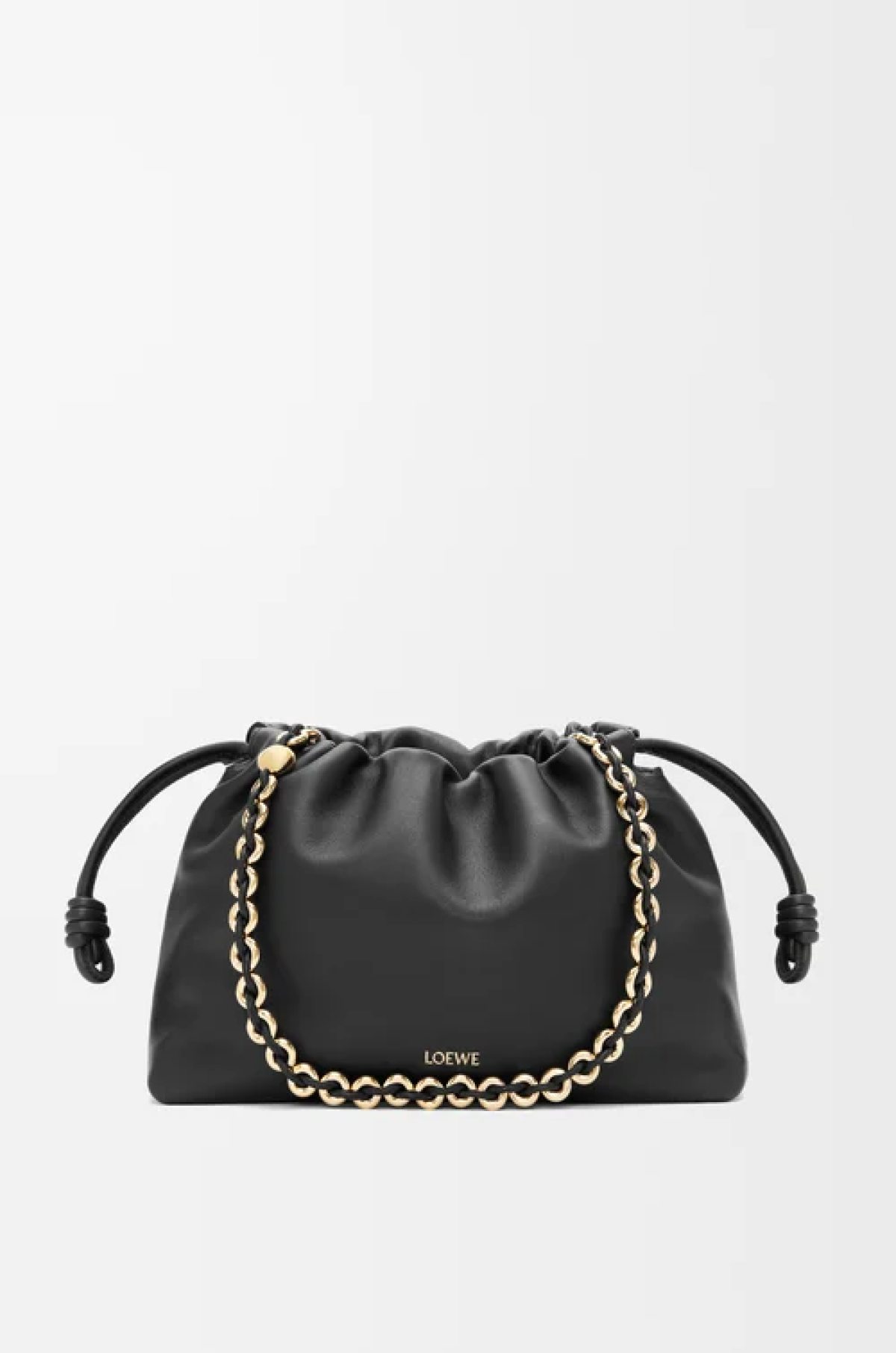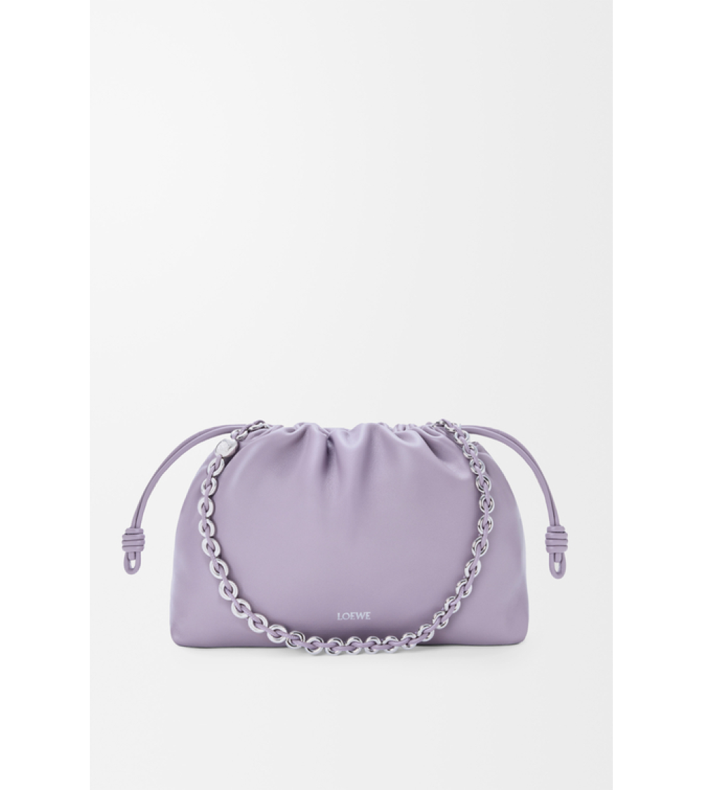 El bolso Flamenco es ligero y suave, con forma fruncida, cordones con nudos históricos y una cadena tipo donut. Esta versión mediana está confeccionada en suave piel de cordero napa.