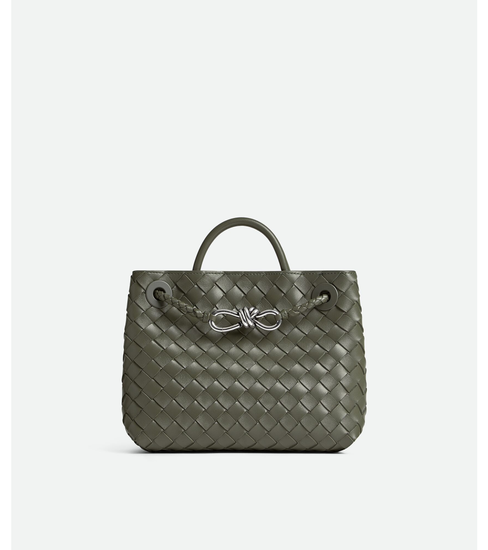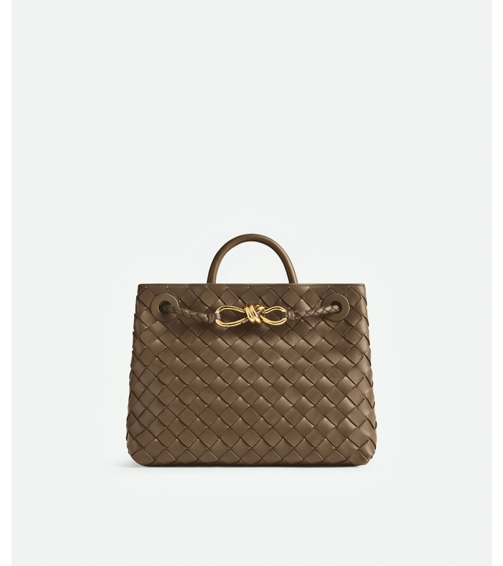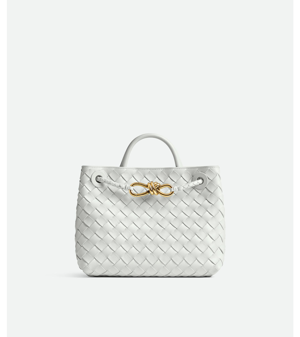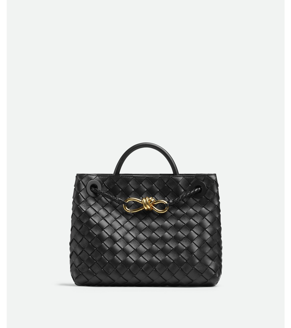Bolso de mano con asa superior en piel Intrecciato flexible, con detalle de nudo característico y correa deslizante para llevarlo cruzado.