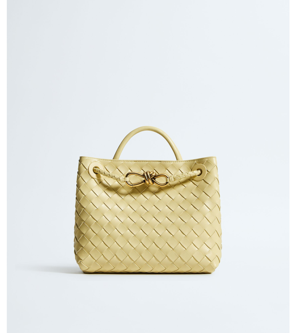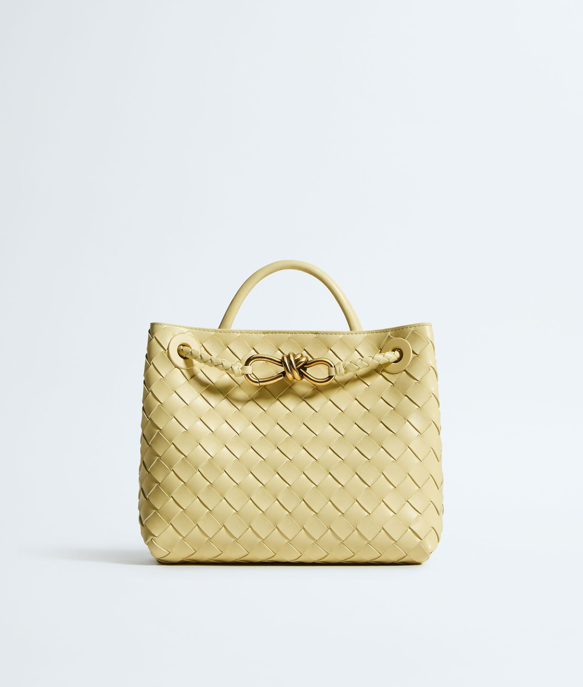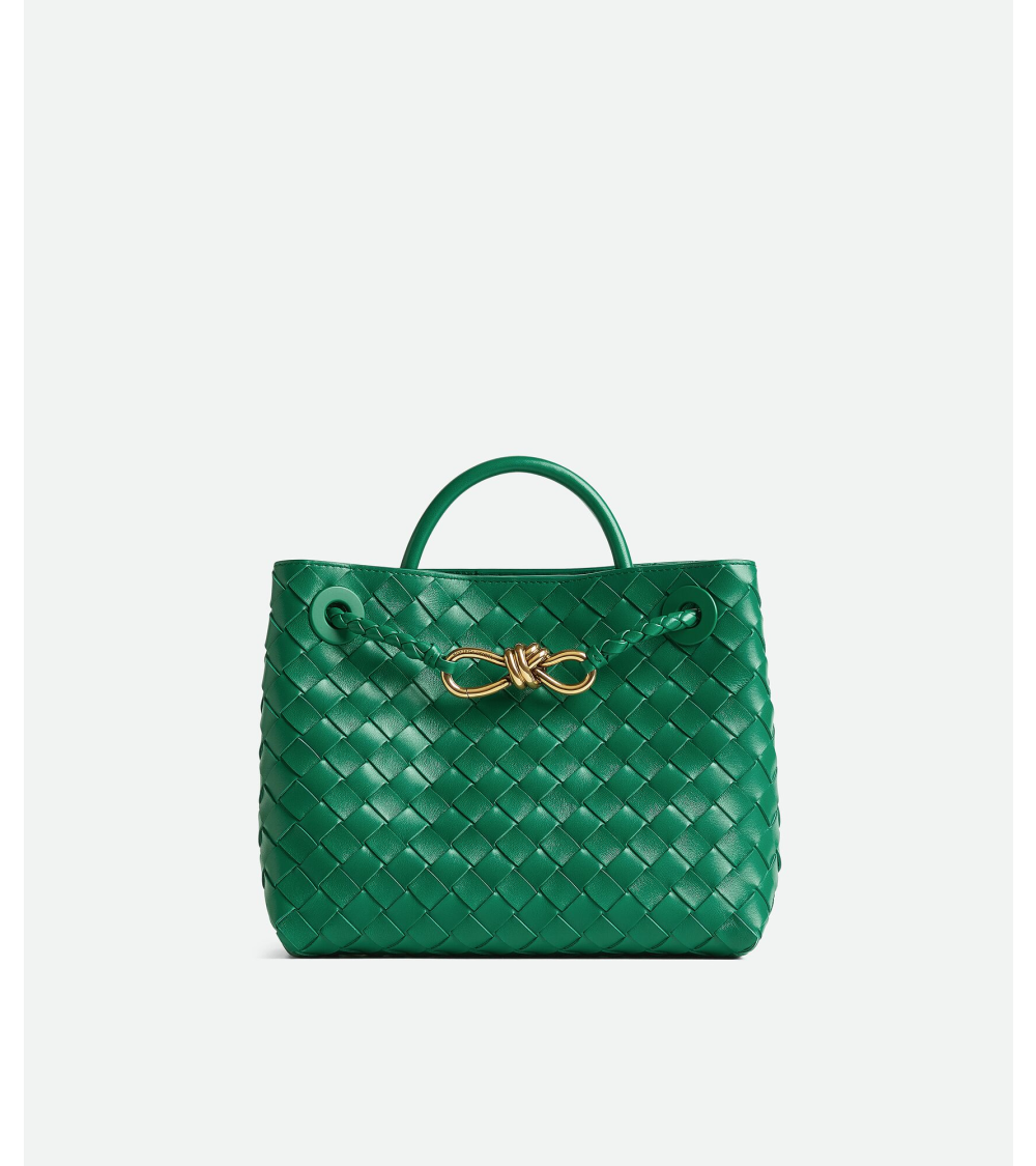 Bolso de mano con asa superior en piel Intrecciato flexible, con detalle de nudo característico y correa deslizante para llevarlo cruzado.