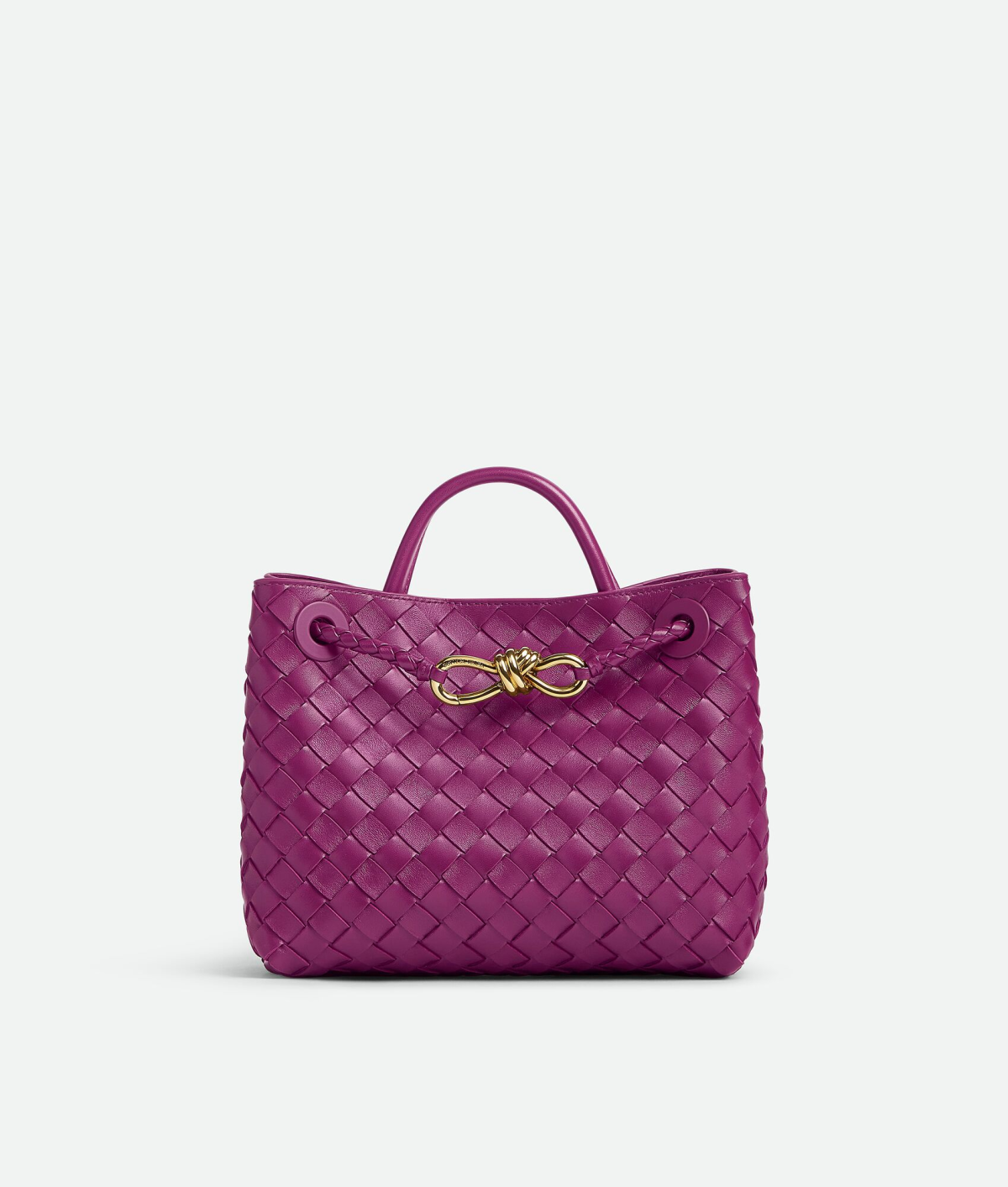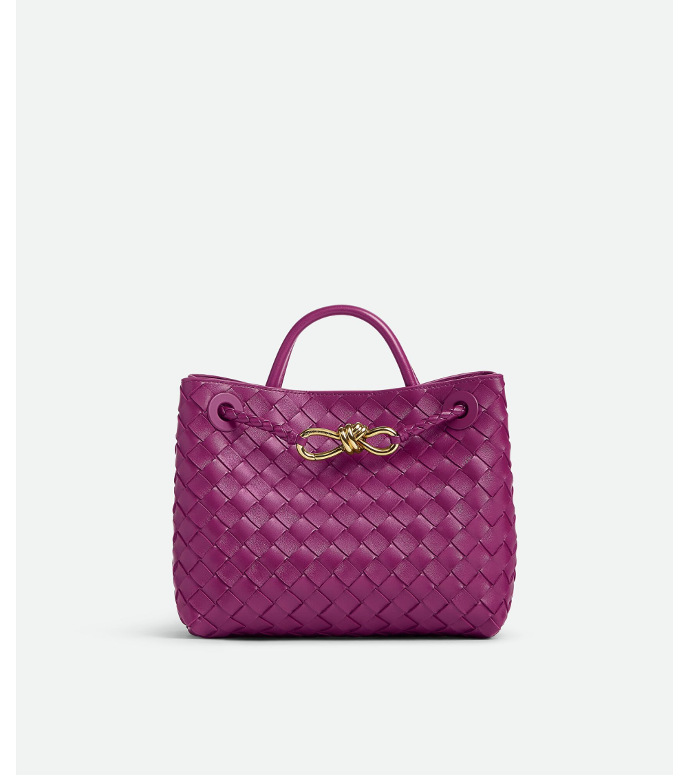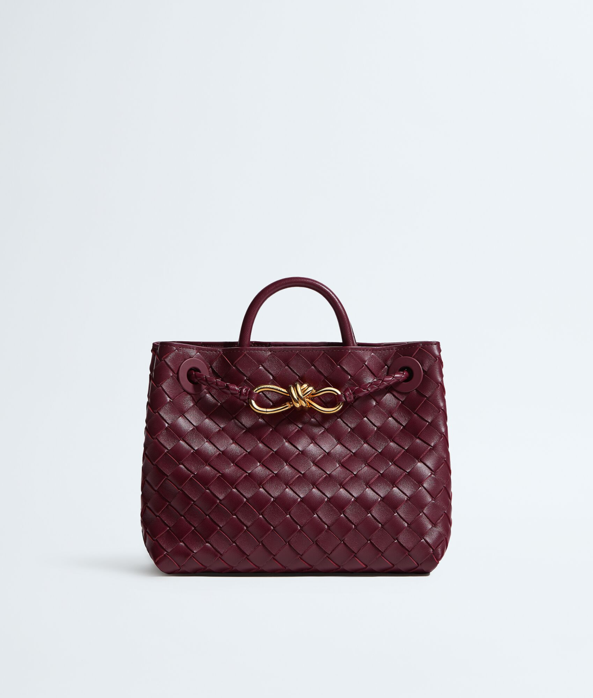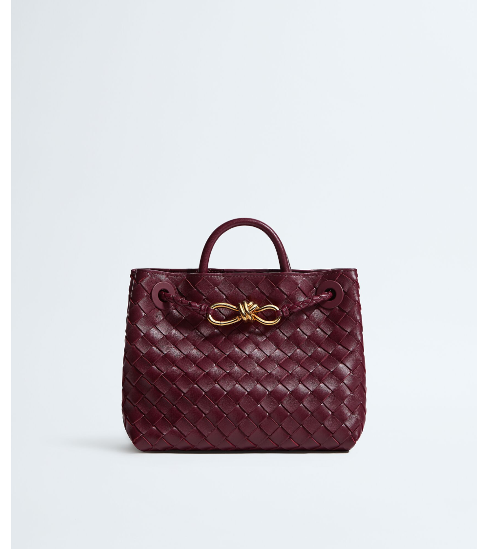 Bolso de mano con asa superior en piel Intrecciato flexible, con detalle de nudo característico y correa deslizante para llevarlo cruzado.